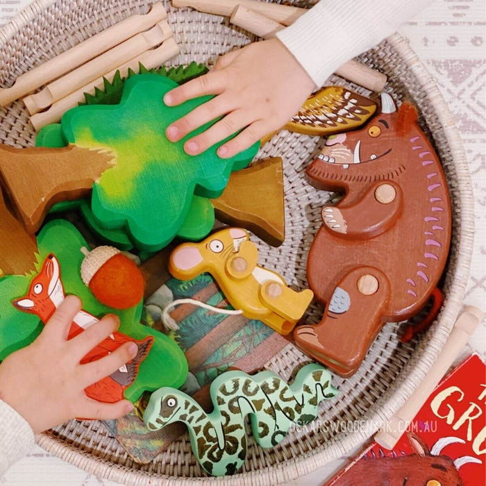 The story about Gruffalo and the little cunning mouse has been a hit with children and parents all around the world since it was first published in 1999. Our wooden Gruffalo and mouse figures allow your children to enter the world of the Gruffalo and his forest friends. They encourage your children to practise their language skills by retelling the stories or by creating their own ones during fun small world or bookish play sessions. Playing with these chunky wooden figurines also practises fine motor skills and hand-eye coordination and fosters imagination and creativity. Both the Gruffalo and the little mouse are interactive and canmove their arms and legs to create different poses.