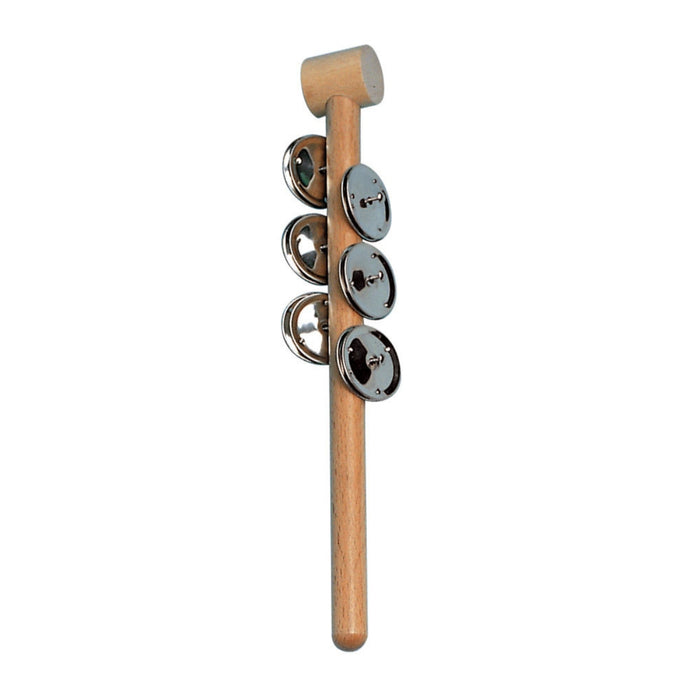 The Goldon Brasil Whip is a simple percussion instrument where a set of 6 bells area attached to a handle, similar to tambourines, jingle sticks and bell sticks.
