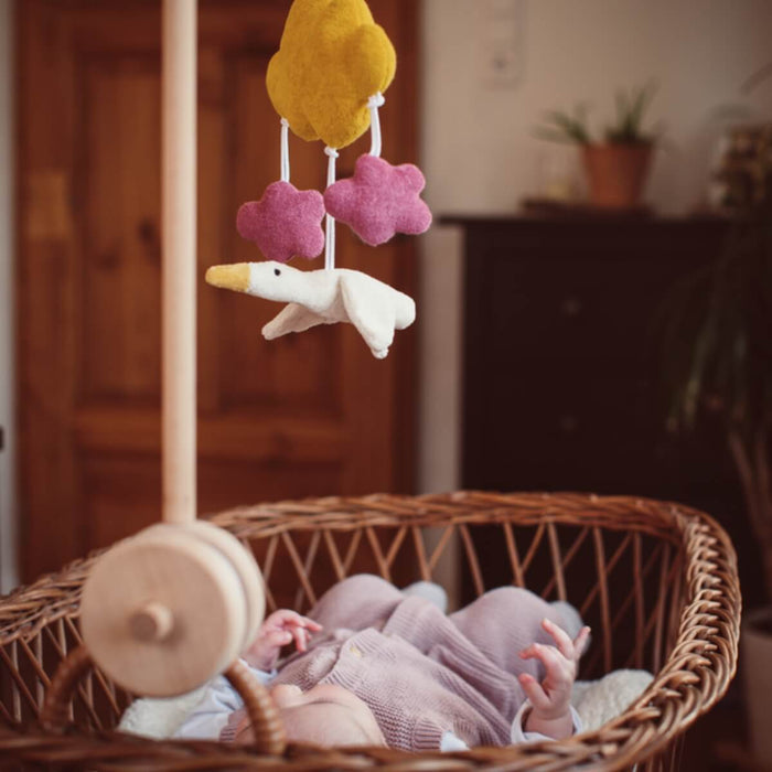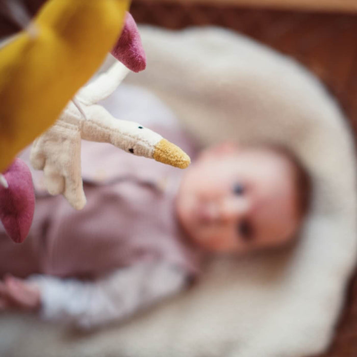 The visual stimulus promotes the urge to more - the child reaches for the moving object it sees and the mobile engages, aiding in physical and intellectual progress. Featuring colorful balls and a little goose, it promotes visual tracking and the notion of color and form - fascination knows no bounds.
