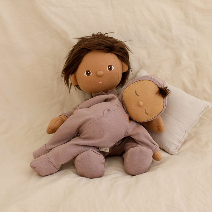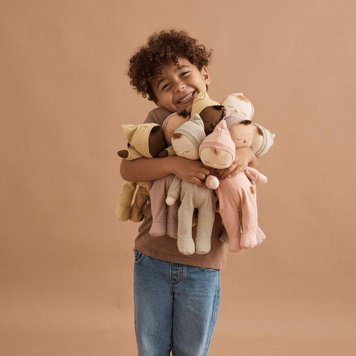 Say hello to Pip! Your baby’s first baby and lifelong friend with the perfect amount of squish for cuddles and play. Like all the Dozy Dinkums, Pip is posable, made from the softest cotton outer, and is the perfect first toy and keepsake. Pip features the sweetest embroidered face with a tuft of hair and wears a non-removable onesie with a rainbow over the heart. Pip is a beautiful gift for newborn babies or would make a beautiful addition to your Dinkum Doll family for older kids too.