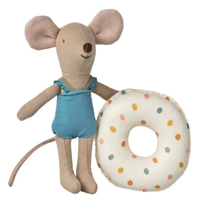 Little Sister Mouse is all set for a beach day, wearing a blue swimsuit and a multi-dot printed floatie for a fun and safe swim in the sea.