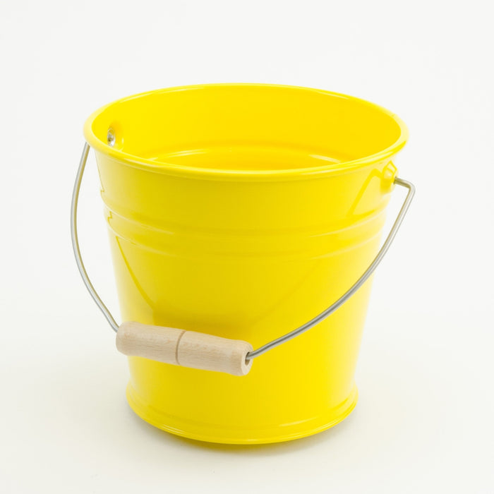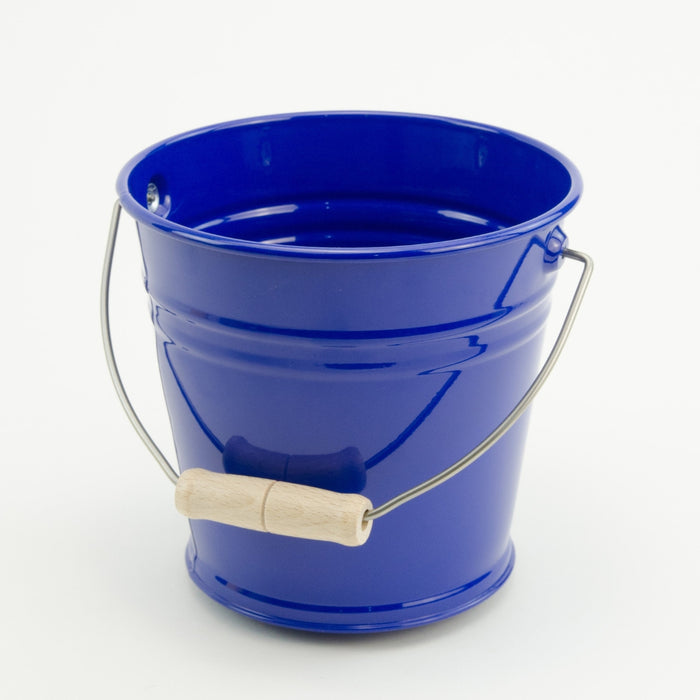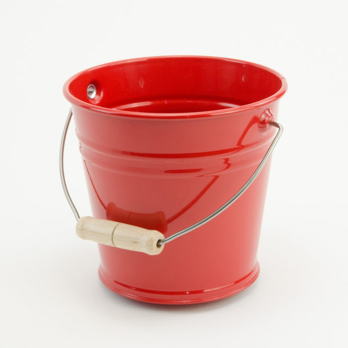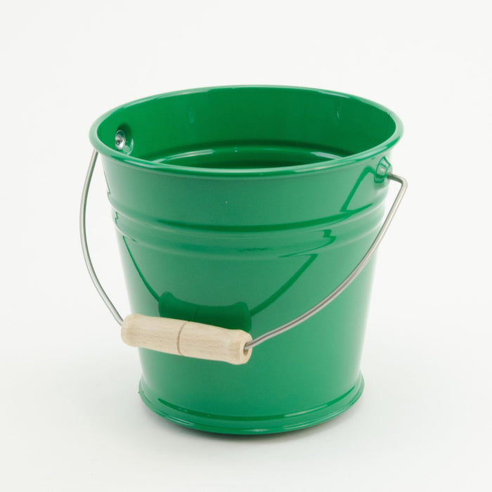The Gluckskafer Metal Bucket comes in 4 different colours you can choose from. Sturdy colourful metal bucket with wooden grip handles.