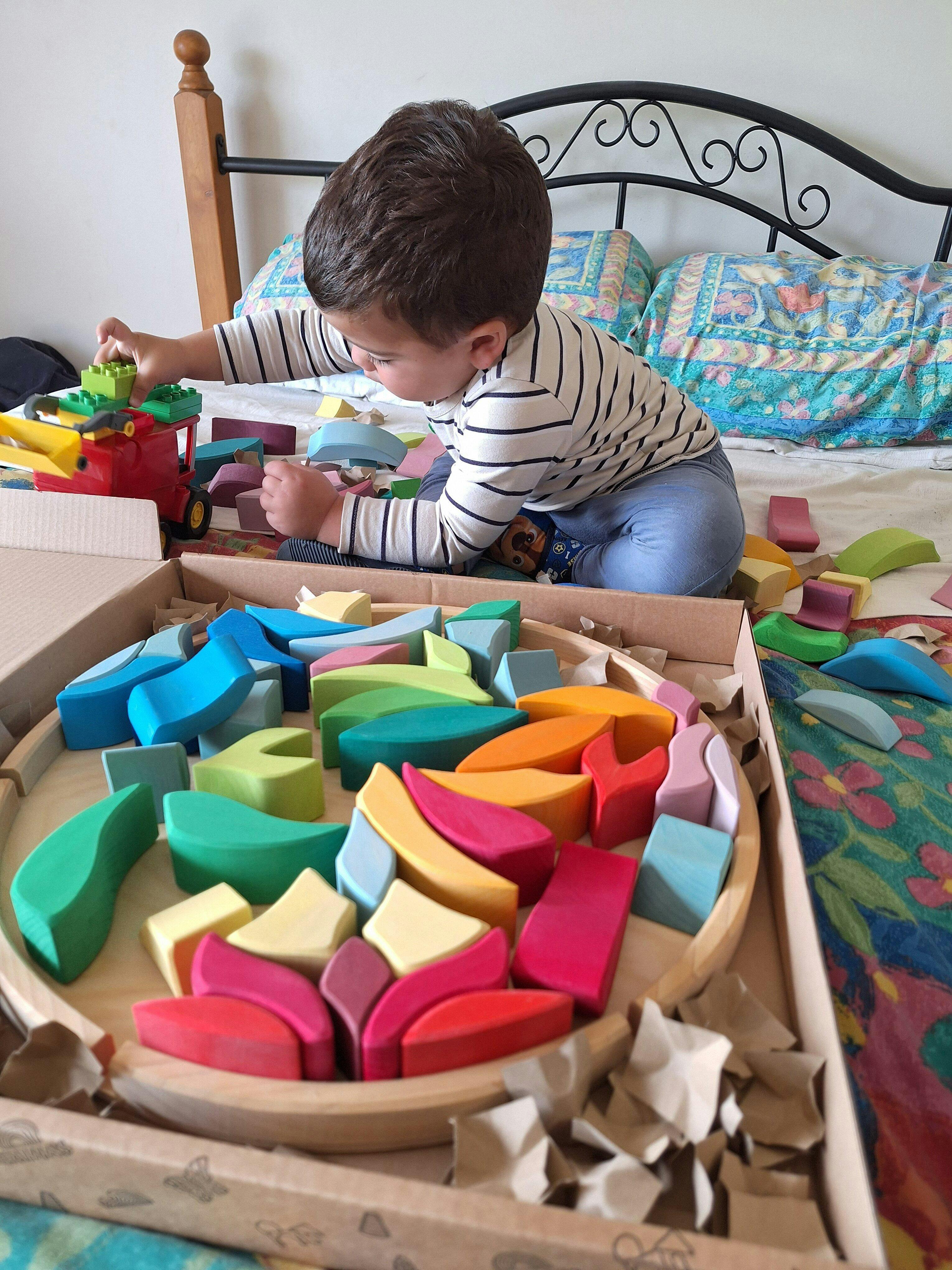 I purchased this for myself for mother's day. It is absolutely beautiful and the colours are so vibrant. Our toddler commandeered it before me and loves playing with it also. The blocks can be used for mandalas, building or loose parts or as a puzzle
