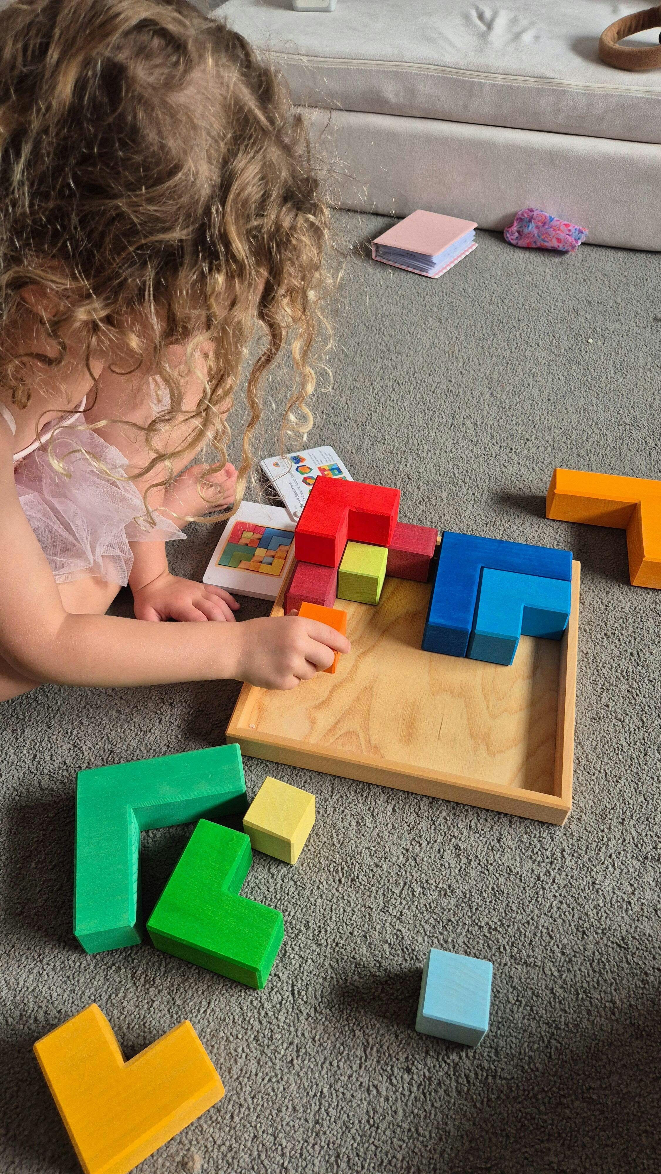 It enables children to create two-dimensional graphic patterns and three-dimensional forms. For more building ideas, feel free to check out our Grimm's Square Puzzle Booklet.
