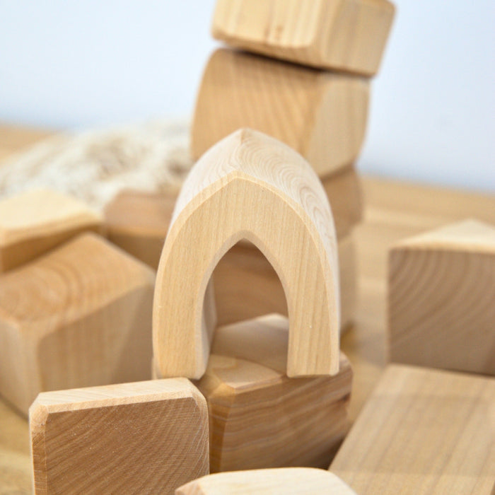These solid handcrafted blocks are made from sustainably sourced European wood. They contain free lovely shapes to support imaginative play.