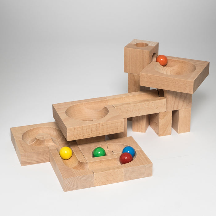 The KADEN Marble Run S "Funnel" features extra funnel pieces included which create a dynamic journey of swirling balls down and around to the next level. As you place the wooden blocks together in multiple combinations, a diverse range of ball runs can be created for endless fun!