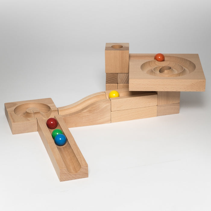 All building components included in this set are meticulously handmade from steam-treated wood for extra durability and stability. The marbles, also crafted from wood, are sanded by hand and beautifully colour-glazed.