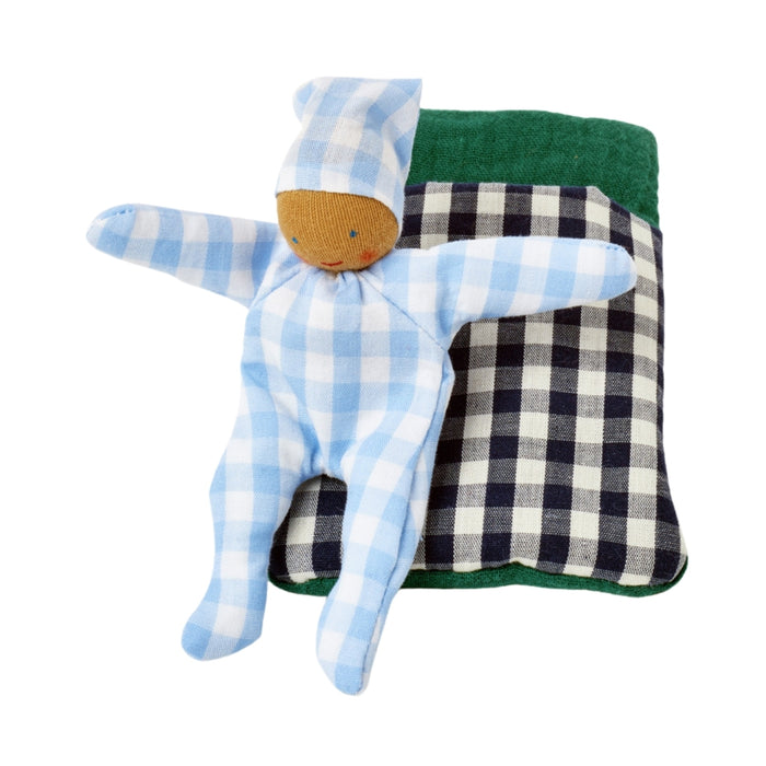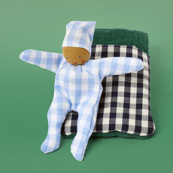 An adorable, versatile soft baby toy featuring a Waldorf-inspired baby doll and a tiny sleeping bag in fun prints, colours, and different gentle textures.