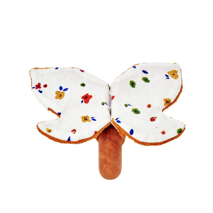 This charming baby toy features a combination of gentle textures, with a wooden ring polished to perfection, soft cotton cords and cloths in vibrant colours, gorgeous prints, and a crackling foil filling that produces soothing sounds.