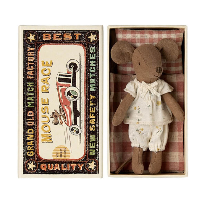 A classic Maileg item. This mouse is ready for hours of play and sleeps snugly in a little matchbox. The clothes and bed linen are made of soft fabrics with unique prints and beautiful colours.