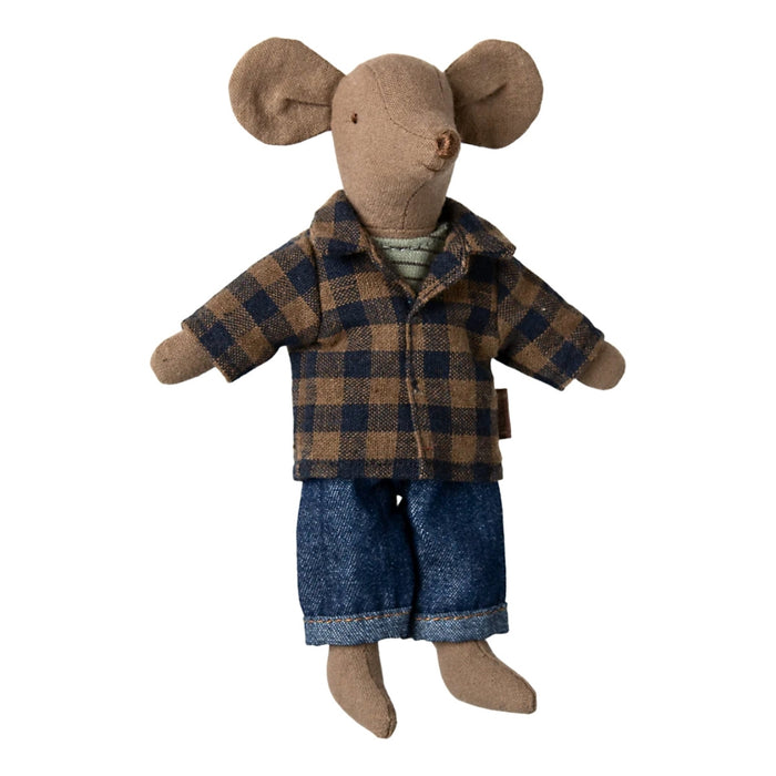 Dad Mouse, made from light brown fabric, is dressed in a checked shirt and denim pants. He fits mouse-sized furniture and accessories, and you can mix and match with additional Mum/Dad-sized clothing.