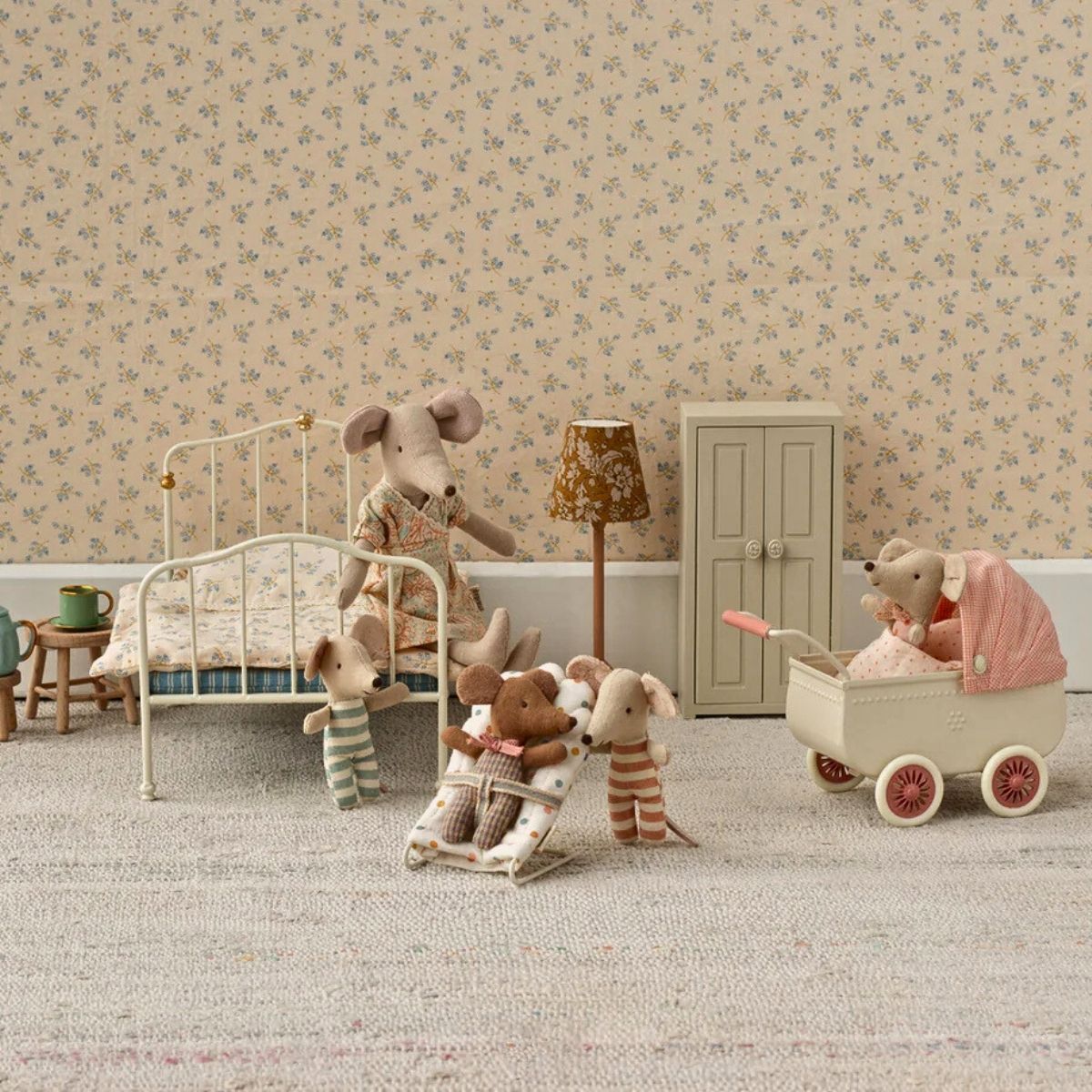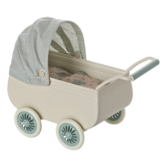This charming vintage-style pram comes with a tiny mouse nestled in a cosy sleeping bag atop a soft mattress. A perfect spot for sweet mouse dreams!