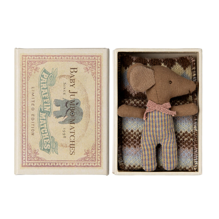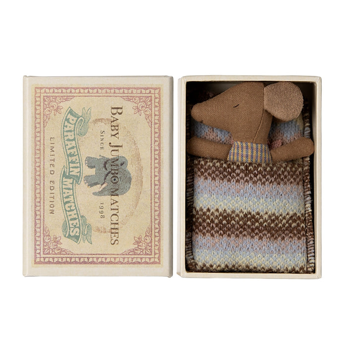 A classic Maileg item. This mouse is ready for hours of play and sleeps snuggly in their little matchbox Sleepy Wakey sleeps soundly on one side and is awake on the other side. The clothes and bedlinen are made of soft fabrics with unique prints in beautiful colours.