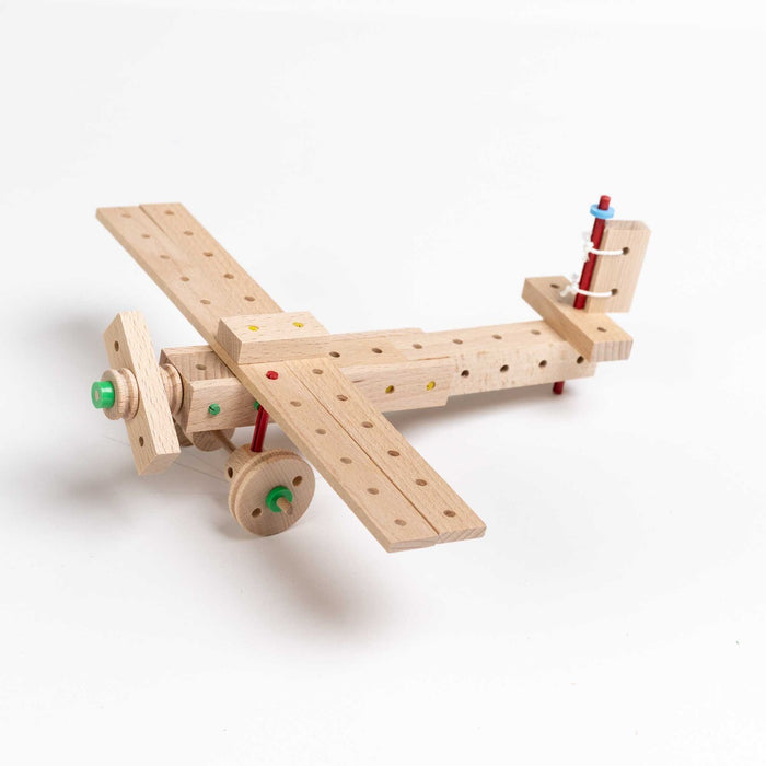 The EXPLORER wooden construction sets by Matador are designed for older children, 5 years and older. These sets fulfil the requirement for both simple and more complex, technically advanced models and landscapes. Using the Matador hammer along with blocks drilled to precision, perfectly fitting linking pins, axles and wheels – a variety of construction options are available, allowing children to develop and implement their imagination and ideas.