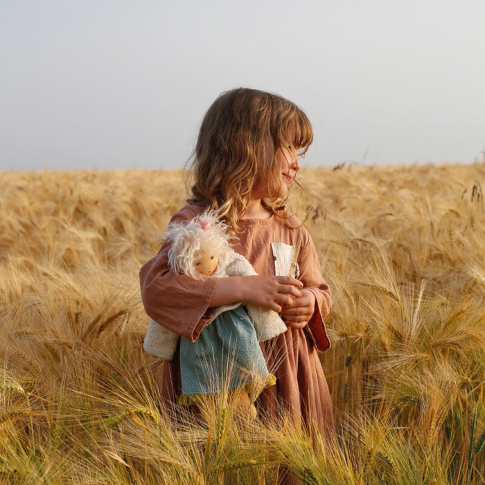Made with almost exclusively certified organic materials and using plant-dyed silk. Each doll's skin and face is made from organic cotton, and clothes are made from organic materials. Our dolls are stuffed by hand with Bioland-certified organic sheep's wool from Germany.