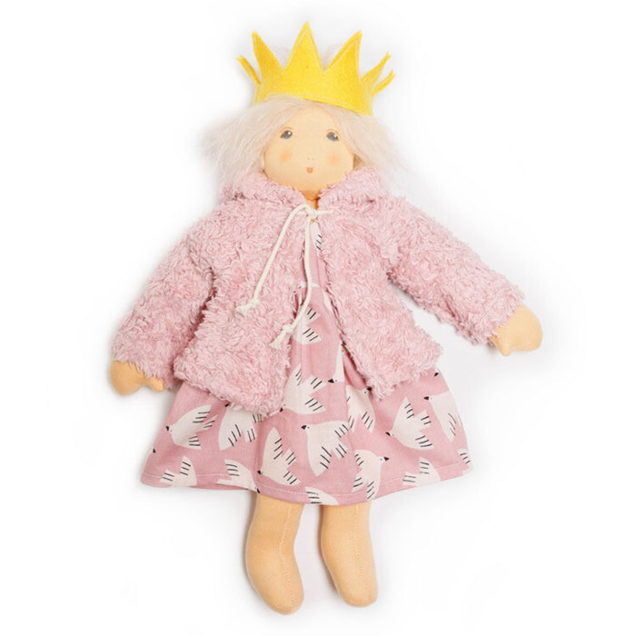 This darling doll wears a beautiful coat, dress, and crown, with realistic wind-blown hair made of high-quality mohair fibres. To style it, your kiddo can use a doll's hairbrush. She's also weighted and can sit upright by herself.