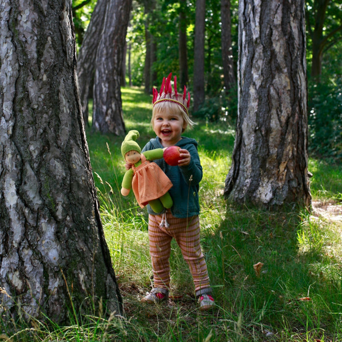 Made with almost exclusively certified organic materials and using plant-dyed silk. Each doll's skin and face is made from organic cotton, and clothes are made from organic materials. Our dolls are stuffed by hand with Bioland-certified organic sheep's wool from Germany.