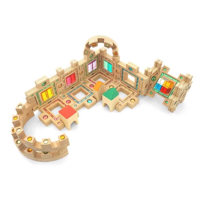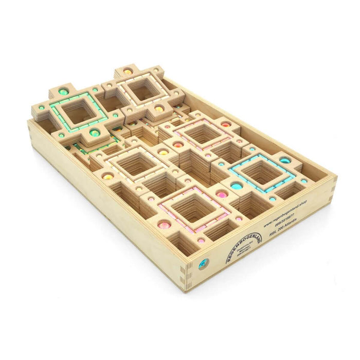 Thanks to brilliant design engineering and precision cutting, nearly all of the pieces in the Regenbogenland range can interlock with each other, inviting children to uncover the endless building combinations and creative possibilities that these unique sets offer.