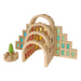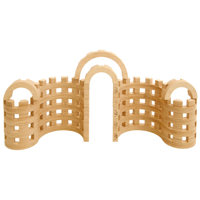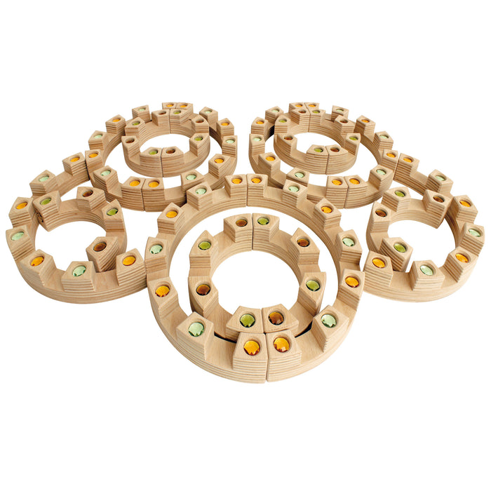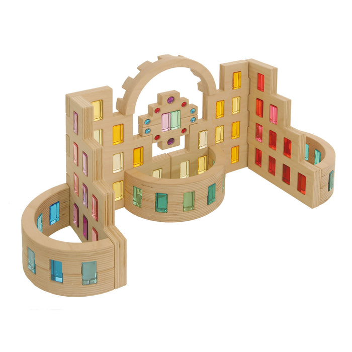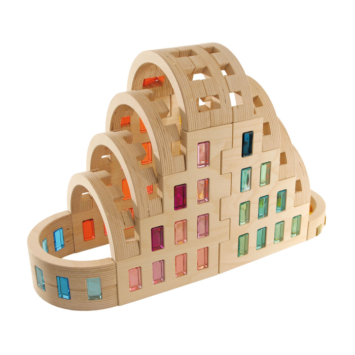 The Regenbogenland Colosseum is a beautiful building block set with 8 large and 8 small semicircular arches, each with small reflecting crystal gems in natural colours embedded evenly throughout the piece. Although exemplary on its own, these semicircular arches become much more impressive alongside other Regenbogenland building block sets such as the Regenbogenland Skyline and Regenbogenland Interlocking Slats. What's ingenious about these building blocks is that every piece can interlock with another due to it's brilliant design and precision cut of each and every piece. With these seemingly simple semicircular shaped blocks, architectural structures such as grand majestic palaces, Romanesque castles and churches or Baroque inspired residences are indeed possible, simply by fitting the pieces together like a jigsaw puzzle. To add another level of awe to the Regenbogenland Colosseum, pair with the Regenbogenland Translucent Rainbow Stones for that fanciful effect.