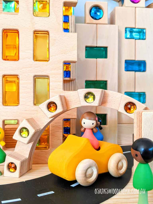 Benno has chosen only the best materials and high quality machines to manufacture his exclusive and unique wooden block sets. All of Regenbogenland’s wooden toys are made and cut from beech multiplex panels. Multiplex is a high quality type of veneer plywood that is known for allowing the creation of intricate shapes. Due to the manufacturing process multiplex panels keep their form and hardly ever chip. Premium CNC (computer numerical control) routers cut and carve out the unique shapes of each Regenbogenland block set. All shapes have rounded corners and smooth edges which make them safe for children to play with. Some of the block sets contain shapes that have been decorated with glass gems or acrylic stones and/or whimsical digitally printed designs. All glass gems and acrylic stones are set safely inside the blocks using a non-hazardous silicone glue which is suitable and safe for children. As the stones and gems are glued straight onto wood, they are not see-through. Some shapes contain cut-outs or windows in which children can place loose translucent rainbow stones like a puzzle for decoration.